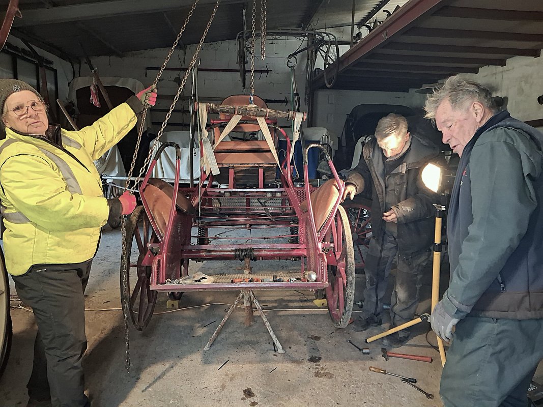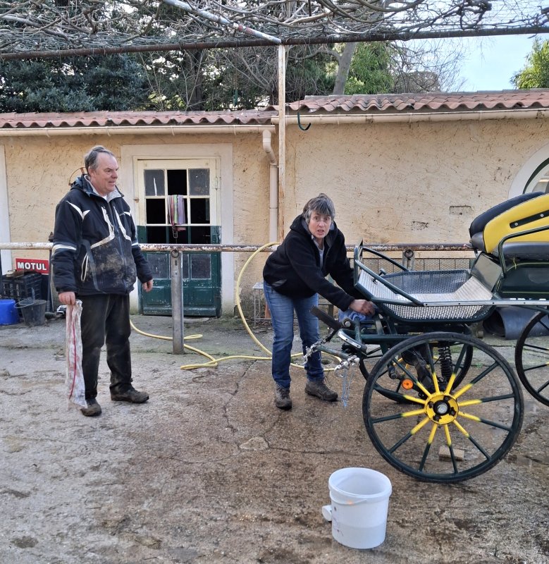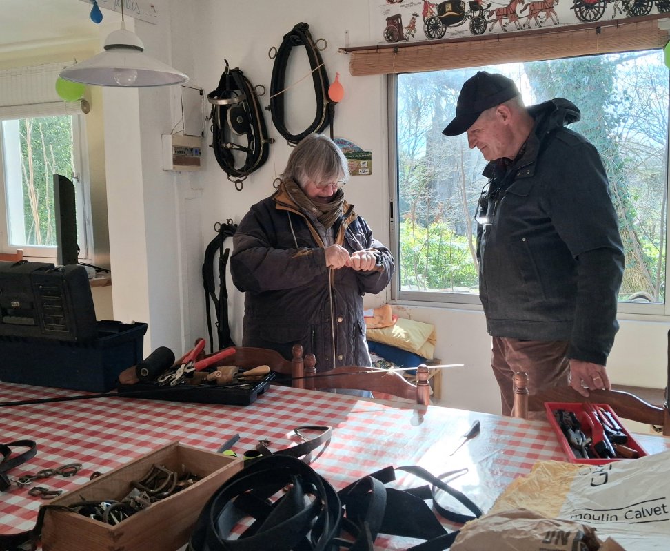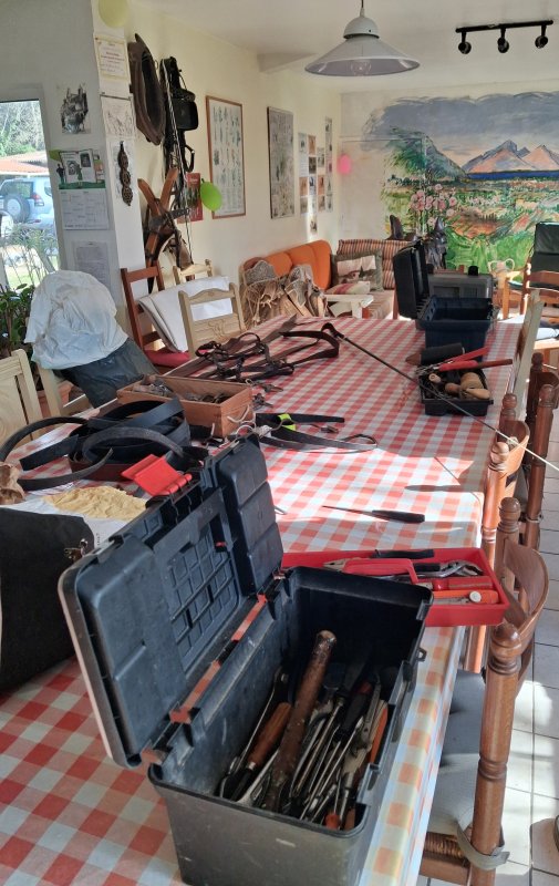Le 15 février 2026, lors de la journée entretien à Villevieille, tout le matériel adéquat est déployé pour les réparations sur les voitures et autres coutures sur les cuirs des harnais.